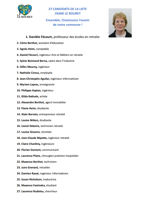 Rourétan depuis 20 ans, je m’engage sur la liste  »J’Aime le Rouret » avec la volonté d’être au service de ses habitants, que chacun puisse apporter son expérience et ses compétences pour un développement plus harmonieux et raisonné de notre commune. Danièle Fécourt, de part son dynamisme et sens du consensus saura, je n’en doute pas, engager notre village sur le chemin d’un bel avenir.